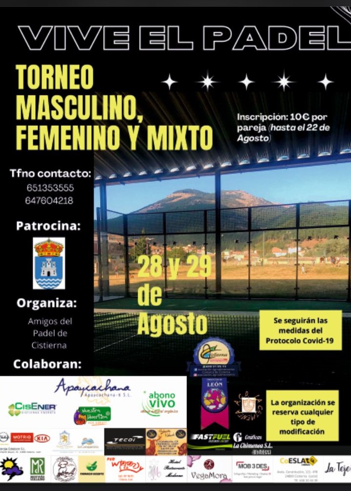VIVE EL PADEL CISTIERNA Sábado, 28 Agosto 2021 - Domingo, 29 Agosto 2021 CONSULTAR HORARIO VIVE EL PADEL TORNEO MASCULINO, FEMENINO Y MIXTO 28 Y 29 DE AGOSTO INSCRIPCIONES HASTA EL 22 DE AGOSTO